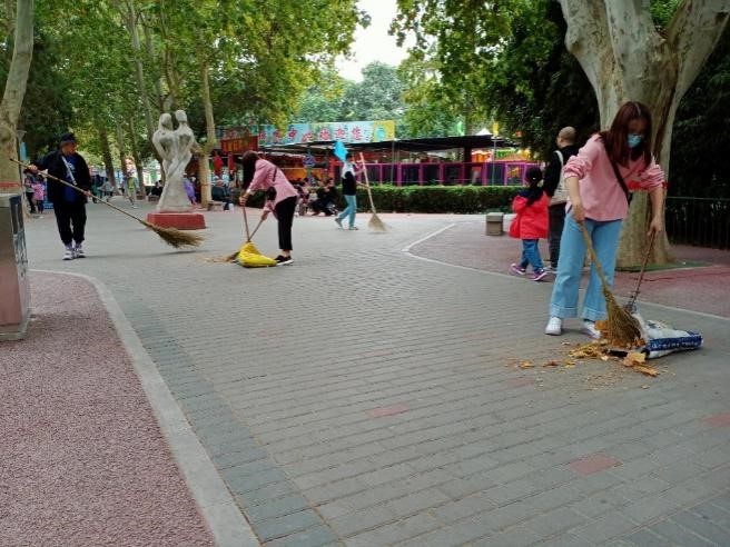 志愿者们在人民公园认真清扫道路卫生