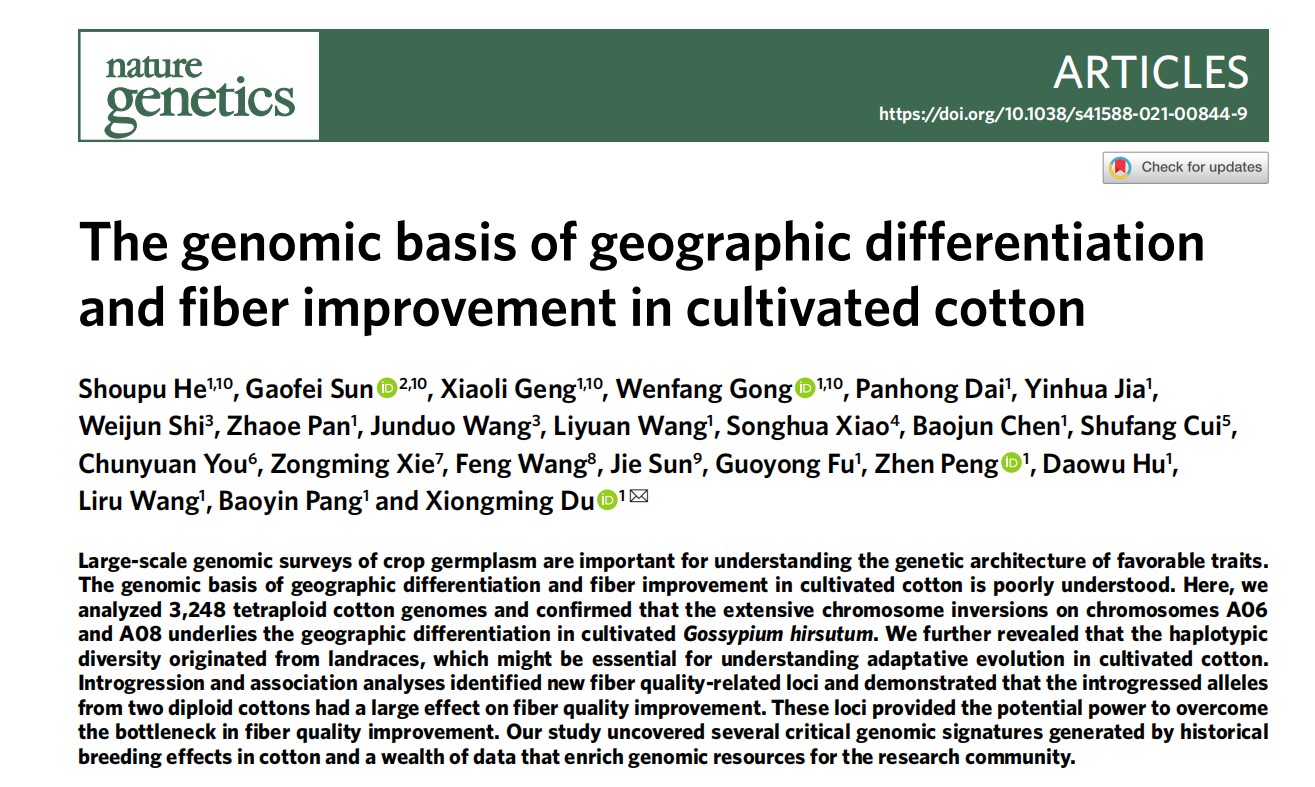 近日,由公司betway必威中国与中国农业科公司棉花研究所杜雄明课题组联合完成的研究成果《栽培陆地棉地理分化和纤维品质改良的基因组学基础》在世界顶级学术期刊《自然·遗传学(Nature Genetics)》在线发表,标志着公司高水平科研成果又取得一项新突破。中科院棉花研究所何守朴副研究员为该论文第一作者,杜雄明研究员为论文通讯作者;公司为该成果的第二完成单位,betway必威中国孙高飞副教授为论文的共同第一作者。